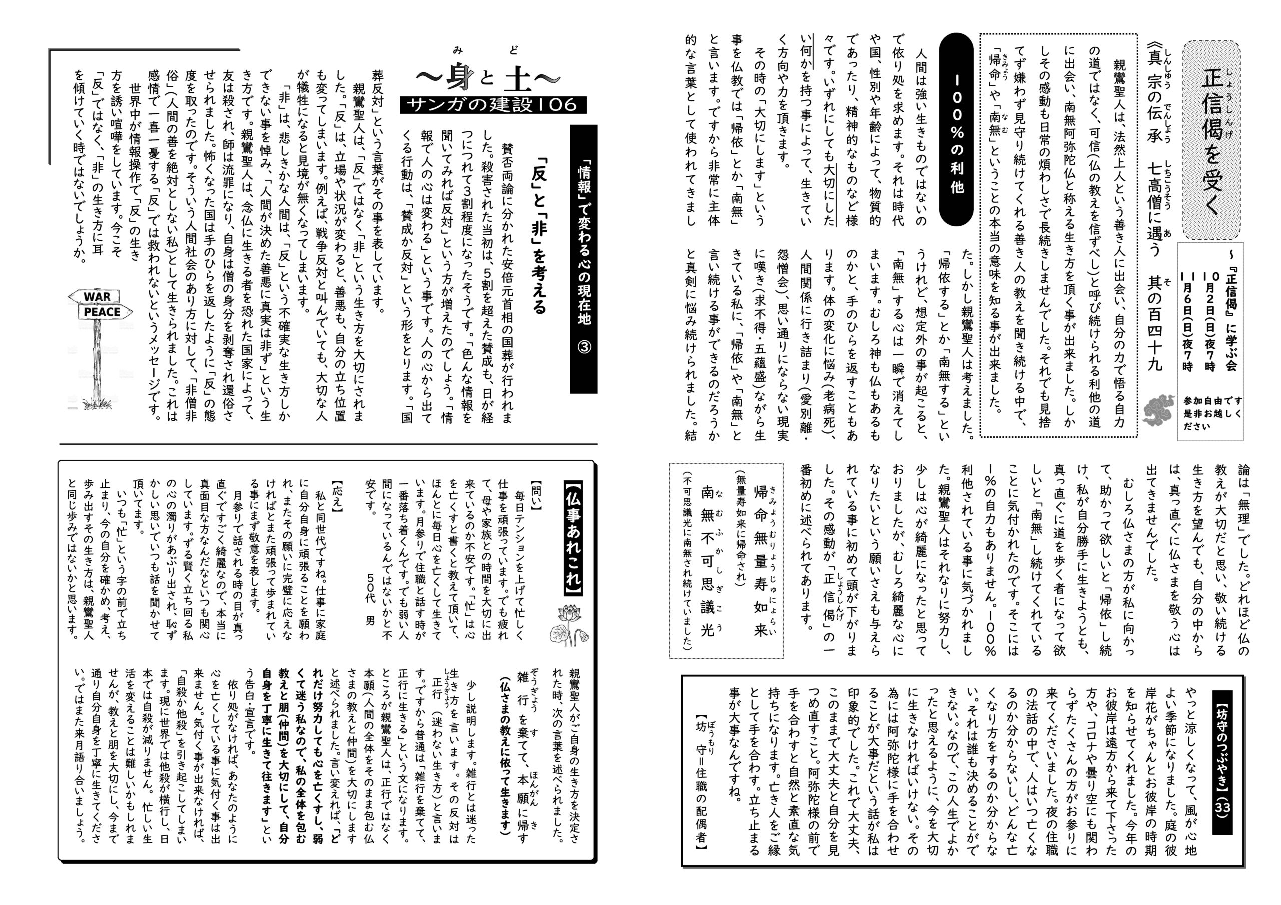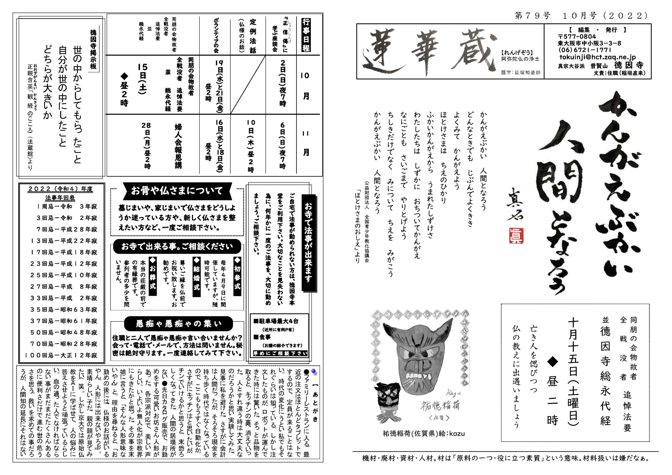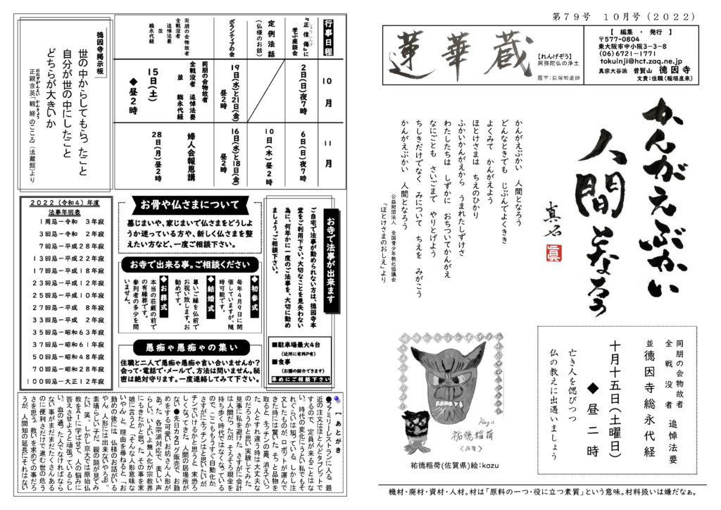 蓮華蔵【れんげぞう】 第79号 10月号(2022年) 2022.10.1 蓮華蔵 かんがえぶかい 人間となろうどんなときでも じぶんでよくきき よくみて かんがえようほとけさまは ちえのひかりふかいかんがえから うまれたしずけさわたしたちは しずかに おちついてかんがえなにごとも さいごまで やりとげようちしきだけでなく みについて ちえを みがこうかんがえぶかい 人間となろう 公益財団法人 全国青少年教化協議会 「ほとけさまのおしえ」より 各記事のリンク集 正信偈を受く 坊守のつぶやき 身と土 仏事あれこれ あとがき あとがき(2022年10月) 真宗の伝承 七高僧に遇う 其の百五十 関連記事 第81号 12月号(2022年) 第78号 9月号(2022年) 第72号 3月号(2022年) 第83号 2月号(2023年) 第70号 1月号(2022年) 第80号 11月号(2022年)
