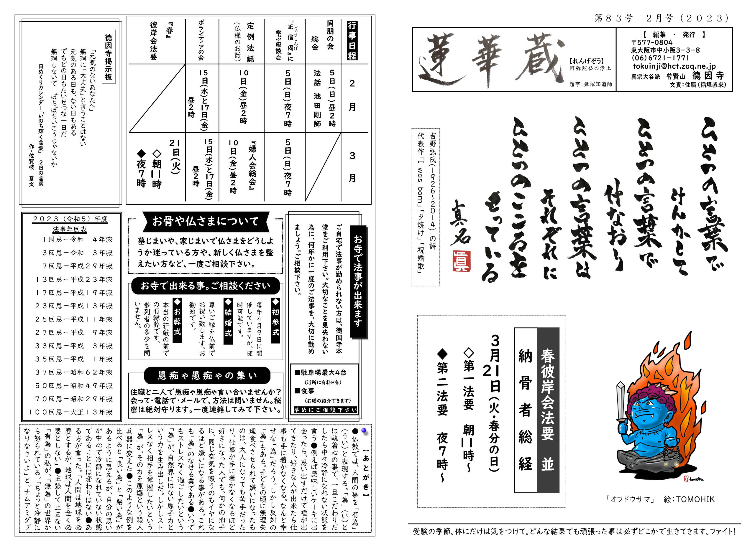 蓮華蔵【れんげぞう】 第83号 2月号(2023年) 2023.2.1 蓮華蔵 各記事のリンク集 正信偈を受く 坊守のつぶやき 身と土 仏事あれこれ あとがき あとがき(2023年2月) 関連記事 第70号 1月号(2022年) 第79号 10月号(2022年) 第78号 9月号(2022年) 第82号 1月号(2023年) 第81号 12月号(2022年) 第72号 3月号(2022年)
