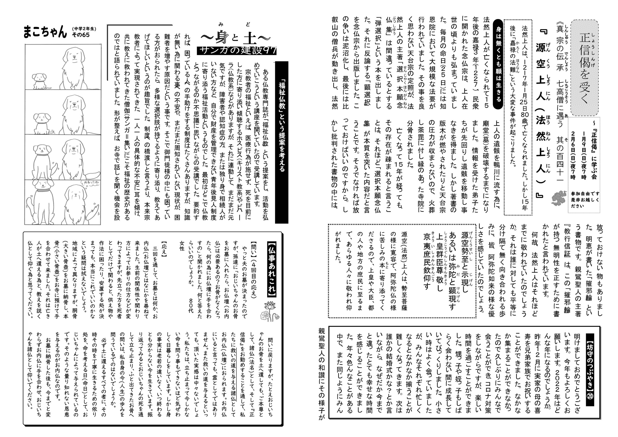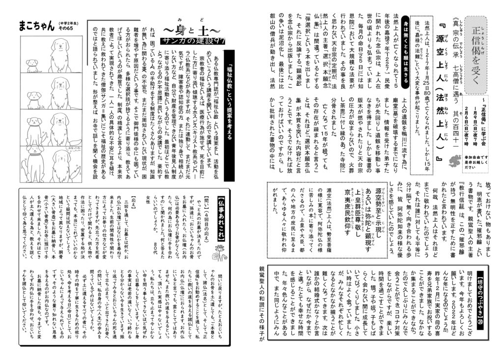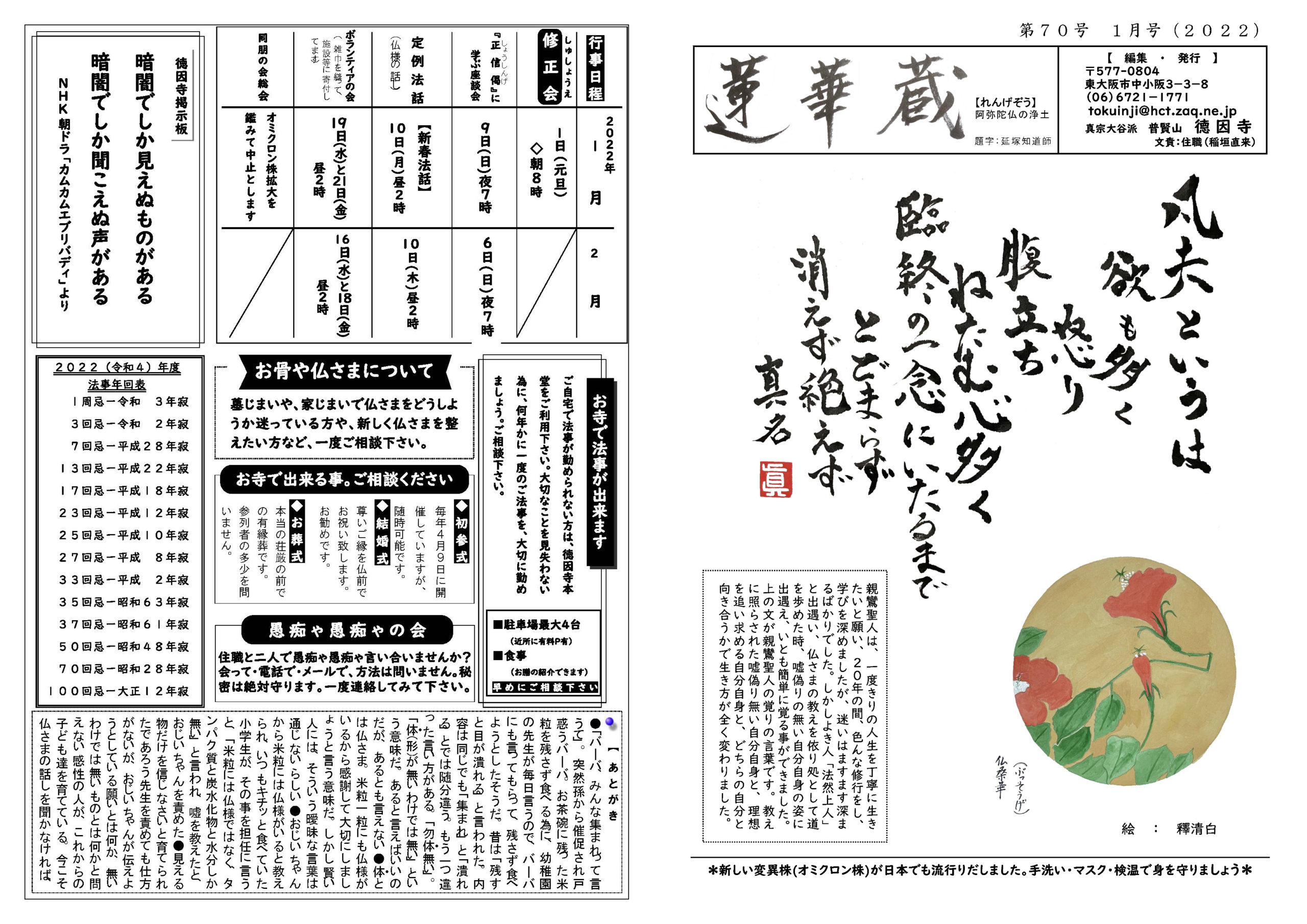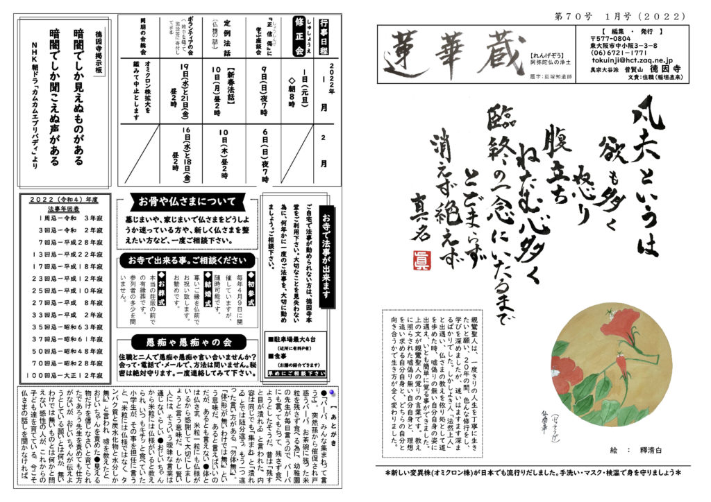 蓮華蔵【れんげぞう】 第70号 1月号(2022年) 2022.1.1 蓮華蔵 親鸞聖人は、一度きりの人生を丁寧に生きたいと願い、20年の間、色んな修行をし、学びを深めましたが、迷いはますます深まるばかりでした。しかしよき人「法然上人」と出遇い、仏さまの教えを依り処として道を歩めた時、嘘偽りの無い自分自身の姿に出遇え、いとも簡単に覚る事ができました。上の文が親鸞聖人の覚りの言葉です。教えに照らされた嘘偽り無い自分自身と、理想を追い求める自分自身と、どちらの自分と向き合うかで生き方が全く変わりました。 各記事のリンク集 正信偈を受く 坊守のつぶやき 身と土 仏事あれこれ あとがき あとがき(2022年1月) 真宗の伝承 七高層に遇う 其の百四十二 関連記事 第79号 10月号(2022年) 第80号 11月号(2022年) 第83号 2月号(2023年) 第72号 3月号(2022年) 第81号 12月号(2022年) 第78号 9月号(2022年)